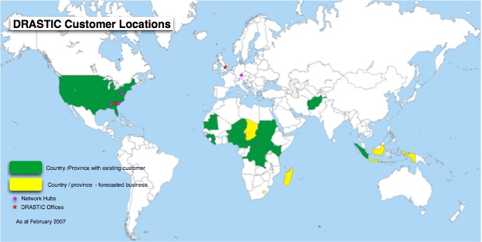 Where do we work? Here is a map showing our the countries where we have current deployments and projects (February 2007.)